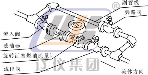 該流量計必須與濾油器配套使用而用水平安裝(即表盤在水平位置),安裝時要注意流體流向,應符合流量計主體上的箭頭所示方向。為了使工藝設備不停止運轉即可檢修流量計與清洗濾油器,應裝設副管線,可參照下面的安裝示意圖。